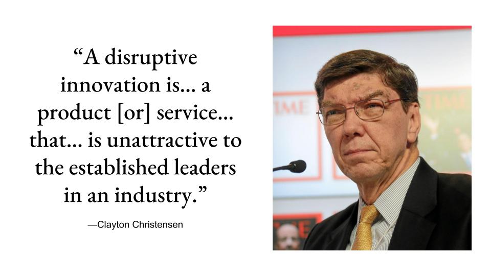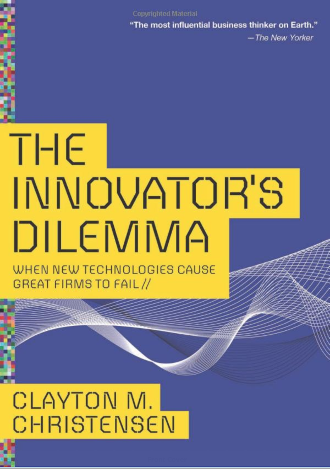 En m'inspirant de ces conseils et suggestions, j'ai commencé à réfléchir au modèle de perturbation innovant. Il a été popularisé dans les milieux d'affaires, à partir de 1997 lorsque le livre « The Innovator's Dilemma » a été publié par Clayton Christensen, professeur à Harvard. Son livre était une extension d'un article antérieur de la Harvard Business Review.