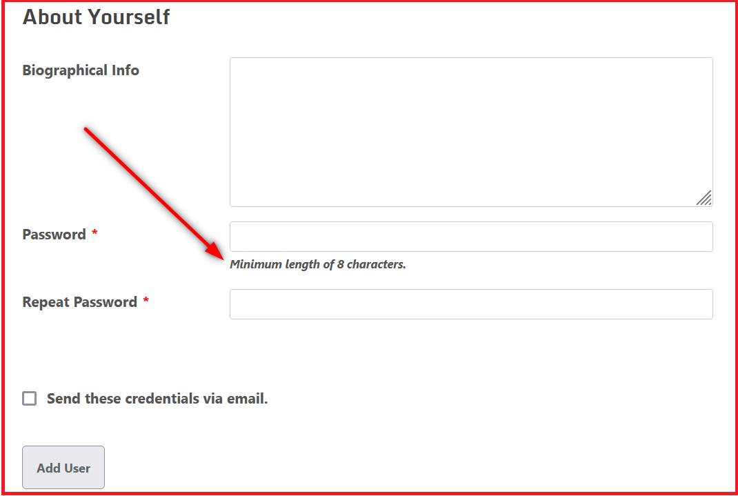 Nous avons essayé de mettre "wordpress" comme mot de passe comme indiqué ci-dessus. Profile Builder ne l'a pas accepté et nous a demandé d'utiliser un mot de passe plus fort à la place.