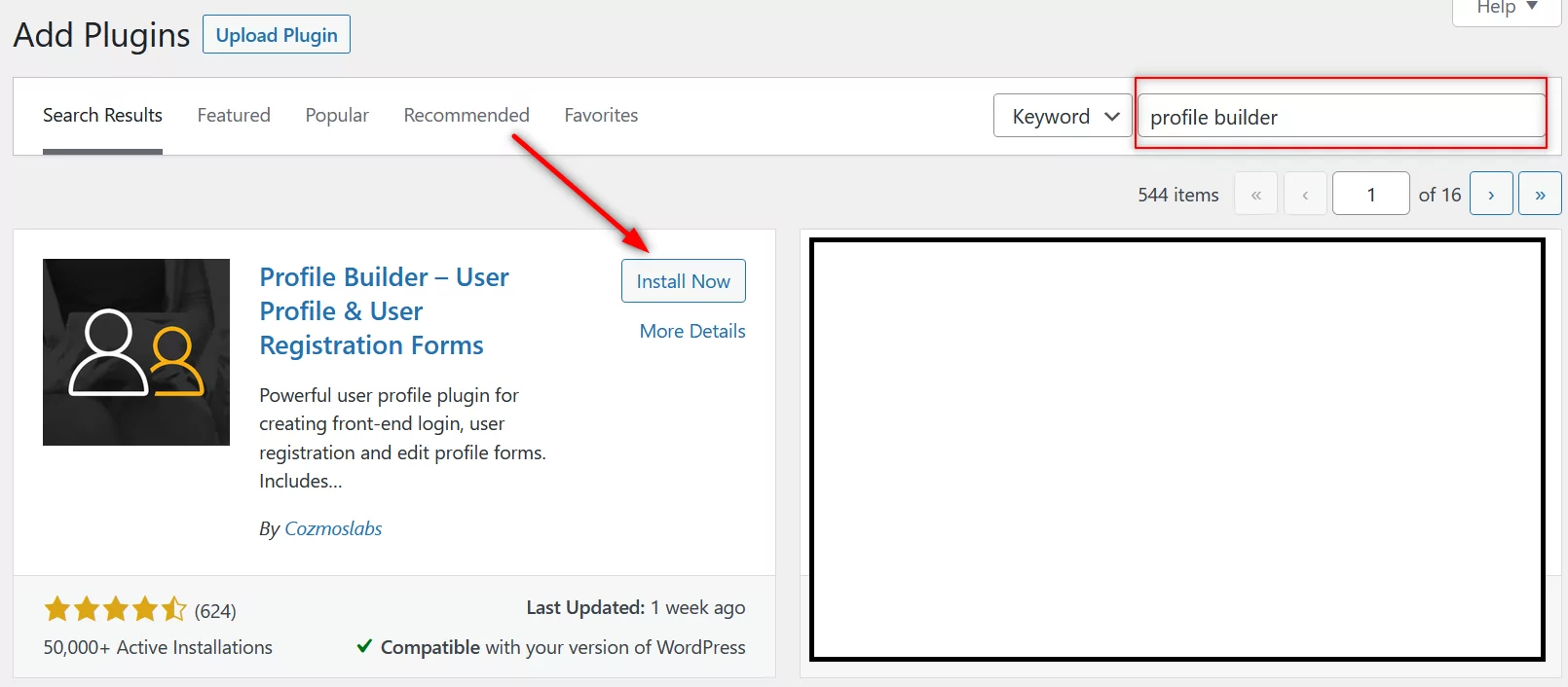 Cependant, si vous comptez utiliser la version gratuite pour le moment, vous pouvez télécharger Profile Builder directement depuis votre tableau de bord WordPress. Cliquez simplement sur Ajouter nouveau dans le menu Plugins , tapez "Profile Builder" dans la zone de recherche, puis cliquez sur le bouton Installer et plus tard sur le bouton Activer .