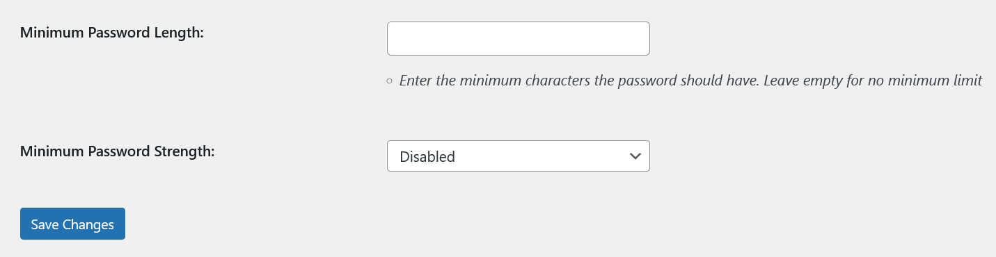 Si vous laissez le champ de longueur minimale du mot de passe vide, les utilisateurs pourront s'inscrire avec un mot de passe aussi court que 2 caractères.