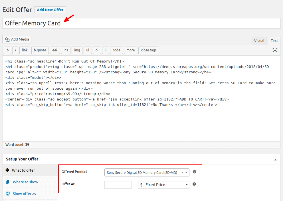- Sous Titre de l'offre, définissez le nom sur « Carte mémoire de l'offre ».