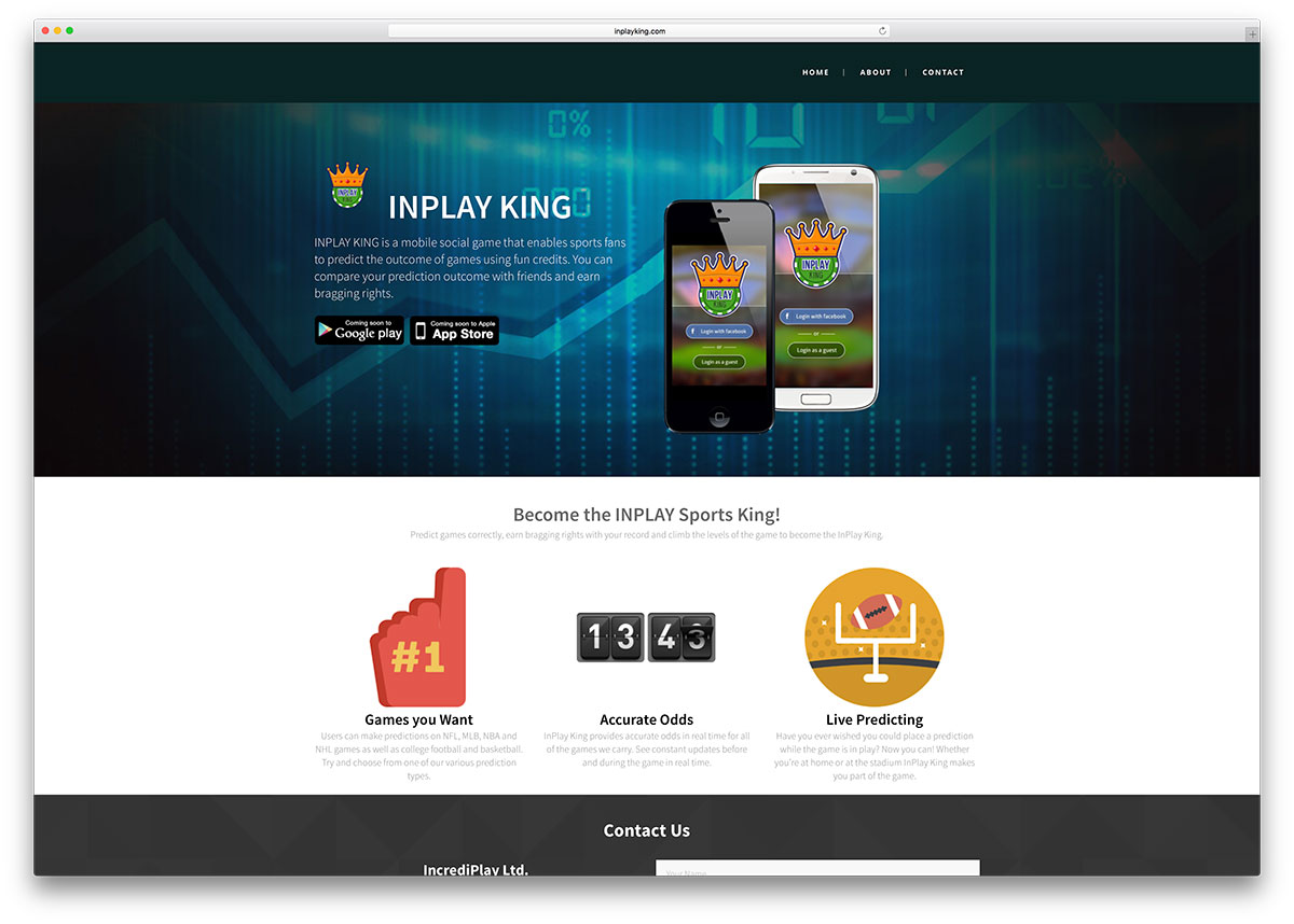 InPlay King adalah gim seluler untuk penggemar olahraga. Kredit menyenangkan dikumpulkan dengan memprediksi hasil permainan dan membandingkannya dengan pemain lain. Ini adalah situs web satu halaman yang dibagi menjadi tiga bagian horizontal.