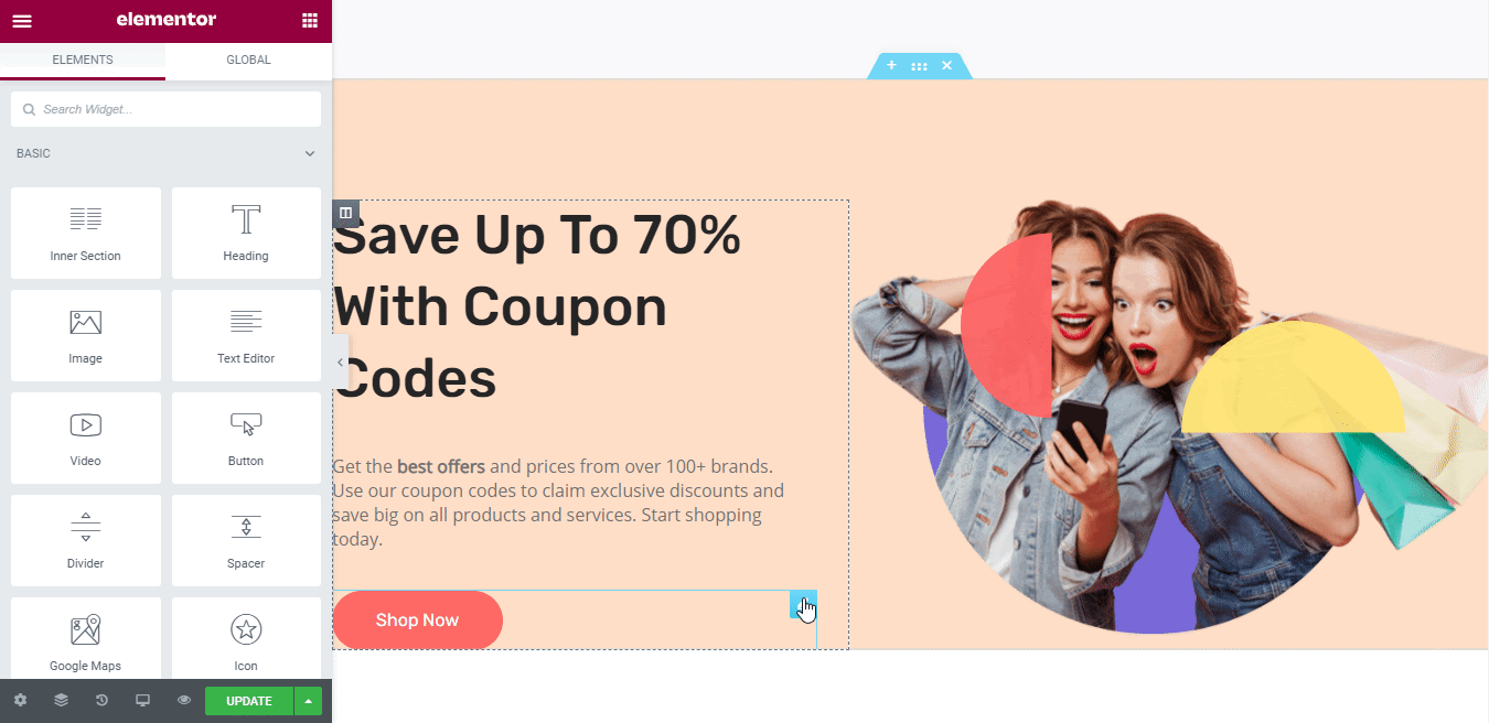 Selanjutnya, klik widget Elementor tempat Anda ingin menambahkan tautan jangkar yang baru saja Anda buat di atas. Untuk contoh ini, kami akan menambahkan tautan jangkar kami ke tombol 'Belanja Sekarang' kami. Untuk melakukan ini, klik pada elemen Tombol, dan buka tab 'Konten' di Editor Elemen.
