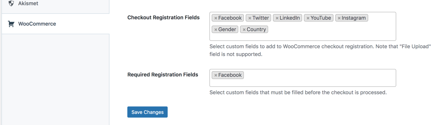 Ketika Anda telah membuat semua bidang yang Anda perlukan, simpan pengaturannya lalu buka ProfilePress > Settings > WooCommerce > Checkout Registration Fields . Tambahkan bidang pendaftaran yang baru saja Anda buat.