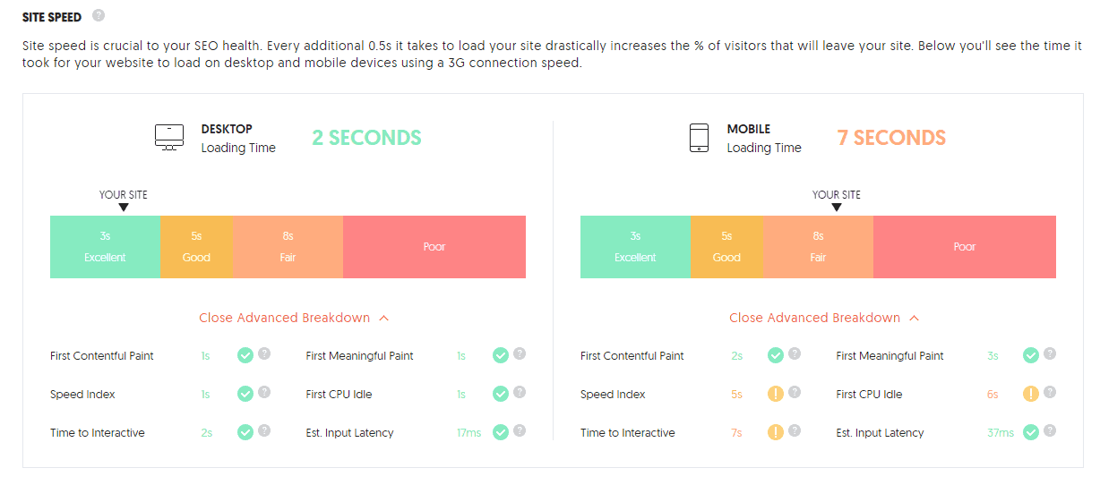 Semua data biasa akan disorot – skor SEO, lalu lintas, kata kunci, dan tautan balik. Anda bahkan akan disajikan dengan kesalahan yang ditemukan dan rekomendasi untuk meningkatkan skor Anda. Dan sementara itu semua adalah angka yang bagus untuk dimiliki, mari fokus pada tujuan kita di sini – kecepatan.
