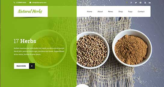 Berdasarkan HTML 5 dan CSS 3, kompatibel lintas seluler dan browser, Natural Herbs menawarkan kombinasi hijau dan putih yang memikat sehingga menciptakan lingkungan yang bersih dan alami untuk audiens online Anda.