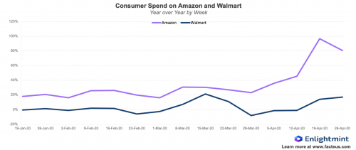 Menurut laporan dari Facteus, sebuah perusahaan yang menyediakan data dari miliaran transaksi dari lebih dari 1.000 perusahaan jasa keuangan, pertumbuhan tahun-ke-tahun Amazon dan Walmart baru-baru ini mencapai 80% dan 18%, masing-masing dalam beberapa minggu terakhir.