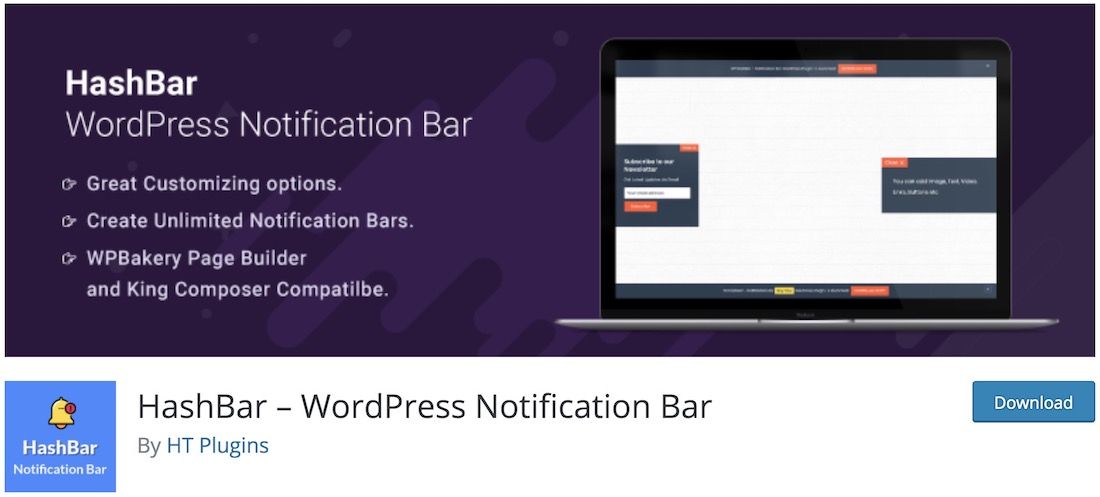 HashBar è un plug-in di notifica WordPress versatile e facile da usare che non ti costa nulla. Devi solo installarlo e attivarlo e sei a pochi istanti dall'aggiunta di una barra di notifica al tuo sito Web o blog. Per quanto semplice possa sembrare. Ovviamente, quando si tratta di configurazioni, hai tutti i tipi di opzioni e possibilità per adattare la notifica alla tua campagna, al tuo marchio e al tuo pubblico con precisione.