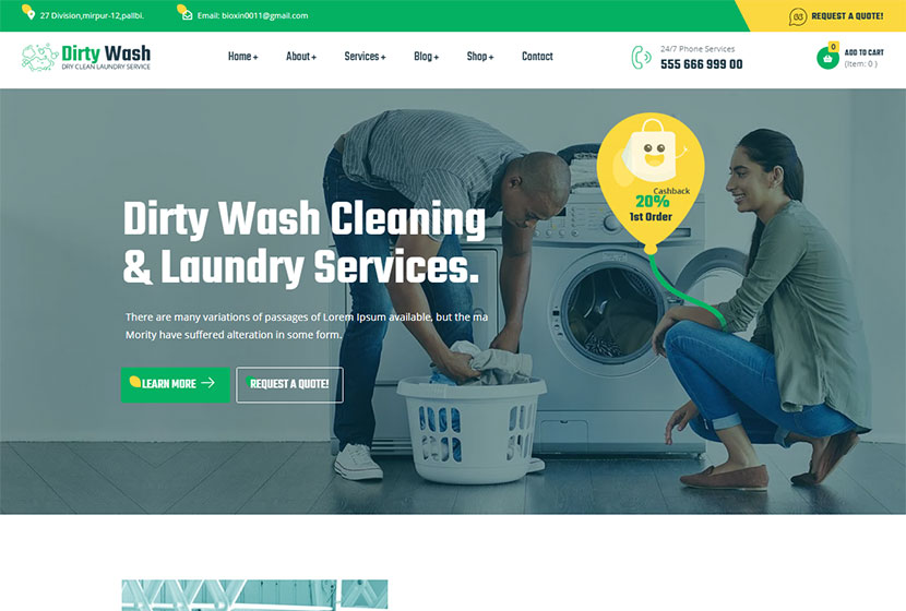 DirtyWash è un tema WordPress per la pulizia adatto per lavaggio a secco, riparazioni, servizi di manodopera, addetti alle pulizie di appartamenti, soluzioni per le pulizie, imbianchini, impianti idraulici, edilizia, tuttofare e altri servizi correlati.