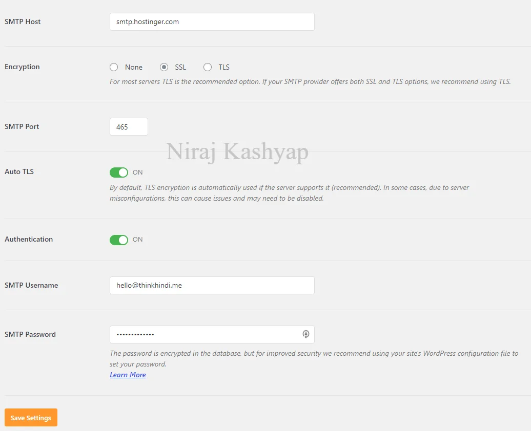 Copia i dettagli dal tuo provider di hosting e inseriscili nelle impostazioni SMTP di WordPress.