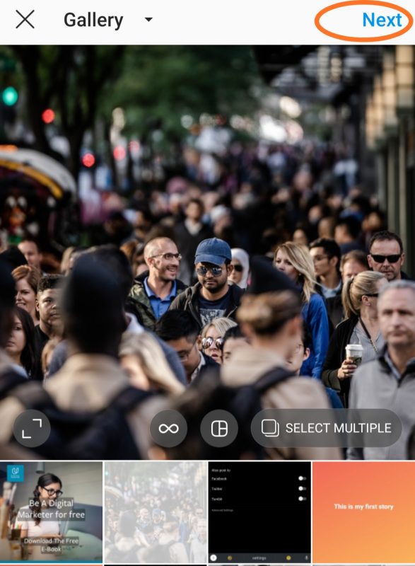 Puoi anche caricare più di un supporto alla volta trasformandolo in una raccolta di foto. Questa funzione è chiamata il carosello di Instagram. Per utilizzare questa funzione, devi selezionare più di un supporto mentre selezioni qualsiasi supporto da caricare.