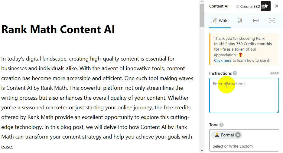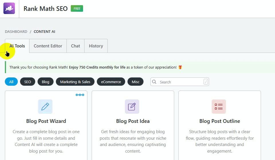 Content AI ha un sistema di crediti, il che significa che se sei un utente gratuito di Rank Math, riceverai 750 crediti gratuitamente al mese.