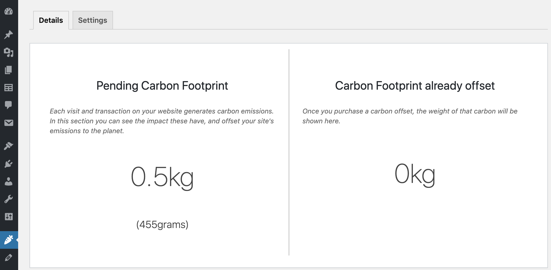 Sfogliando il repository di plugin di WordPress.org, sembra che la piattaforma abbia solo una manciata di plugin progettati per aumentare la consapevolezza degli utenti sulle emissioni di carbonio. Il plug-in Website Carbon offre agli utenti un'ampia panoramica dell'impatto delle emissioni del proprio sito, inclusa la segnalazione se il data center in cui è ospitato il sito è alimentato da energia rinnovabile. CO2ok per WooCommerce è un altro plugin che si integra con un servizio per l'acquisto di offset.