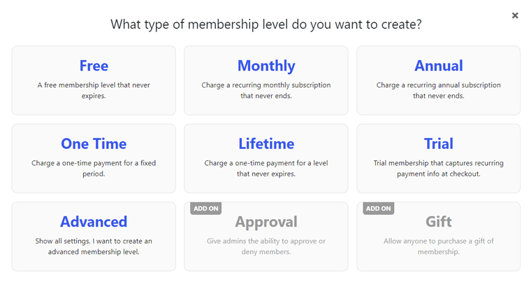 Questo apre un popup che mostra i diversi tipi di livello di appartenenza che puoi creare. Le opzioni sono gratuite, mensili, annuali, una tantum, di prova, ecc. Quindi, fai clic su quella che ti serve.