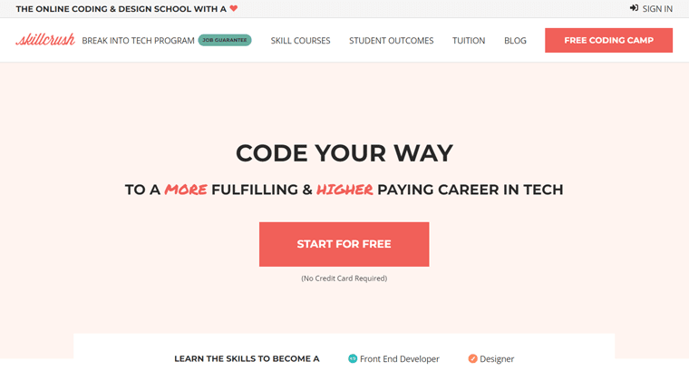 - SkillCrush: campi di programmazione gratuiti e corsi a pagamento con un'opzione di pagamento una tantum per apprendere lo sviluppo front-end e le competenze di progettazione.