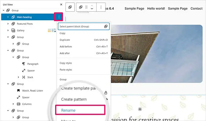 Innanzitutto, ora puoi rinominare i blocchi Gruppo nella visualizzazione elenco. Ciò ti aiuterà a identificare cosa fa ciascun blocco di gruppo e renderà i tuoi layout più leggibili.