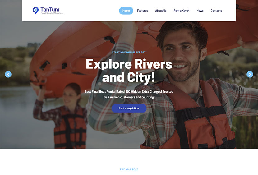 TanTum è un tema WordPress per servizi di noleggio auto, scooter, barche e biciclette che viene fornito con oltre 5 layout di home page, ciascuno adatto per il noleggio di un determinato tipo di trasporto, in cui scooter e kayak non fanno eccezione. Si basa sul generatore di pagine drag-and-drop front-end di Elementor; include le pagine già pronte: Servizi, Informazioni, Noleggio, Galleria, moduli di contatto avanzati, integrazione del feed di Instagram, compatibilità del sistema di autonoleggio, codici brevi multipli premade e molte altre funzionalità.