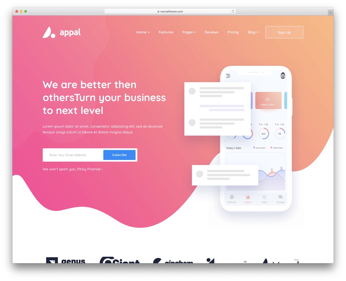 読み込み速度の速さ、モバイル対応のレイアウト、検索エンジン最適化、料金プラン、特殊効果、スティッキーナビゲーションは、Appalの他のすべての追加特典です。 スタートアップ、アプリ、ランディングページ、SaaS向けの注目に値する非常に印象的なウェブサイトには、Appalが最適です。