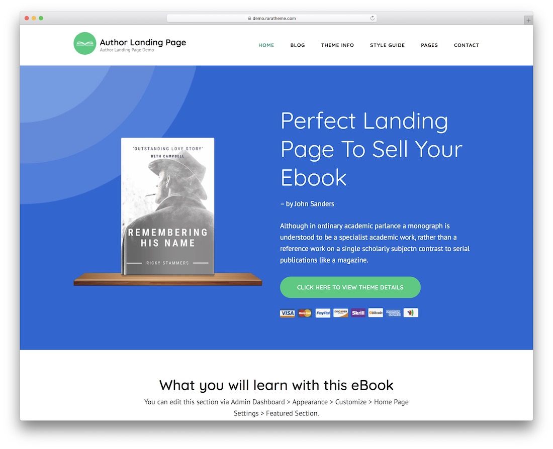 オンラインで自分の作品を宣伝することに興味がある人は誰でも、AuthorLandingPageは無料のWordPressテーマです。 本や電子書籍をプッシュしたい作家、出版社、著者は、著者ランディングページを使用することを歓迎します。