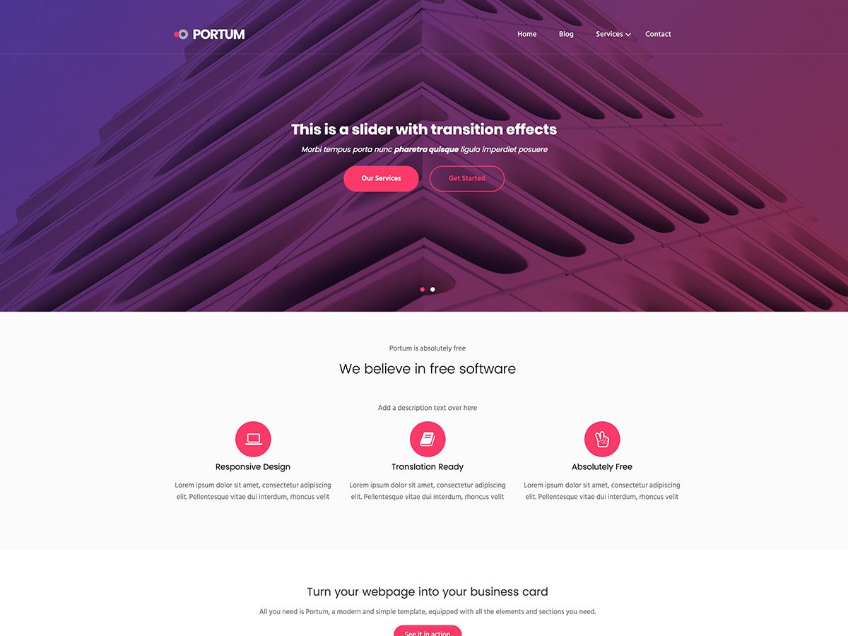 Portum Materialには、大きなフルスクリーンスライダー、召喚ボタン、アニメーション、サブスクリプションフォーム、およびGoogleマップが付属しています。 ビデオを紹介してポートフォリオを作成することもできます。 1つ確かなことは、最終製品は、どんなに微調整しても、スタイルをプロフェッショナルで洗練されたものに保つことです。