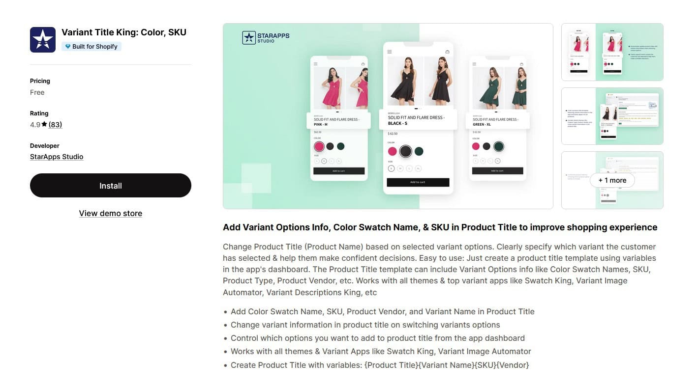 色、SKU、ベンダー、バリエーション名などの詳細を製品タイトルに直接表示することで、Variant Title King は混乱を軽減し、信頼を築き、より透明性の高いショッピング エクスペリエンスを生み出すのに役立ちます。