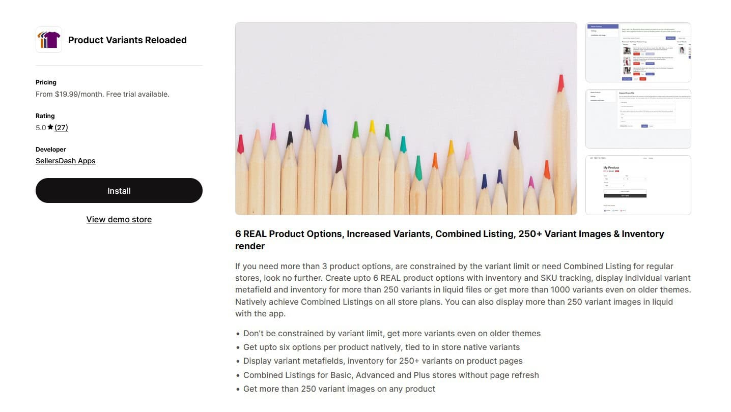 Product Variants Reloaded は、Shopify のネイティブ バリアント制限を超えた販売者向けに構築されています。 3 つ以上の商品オプションが必要な場合、バリエーションの制限に達している場合、またはハッキングやページのリロードを行わずに真の統合リストを表示したい場合、このアプリは強力な内部機能を提供します。