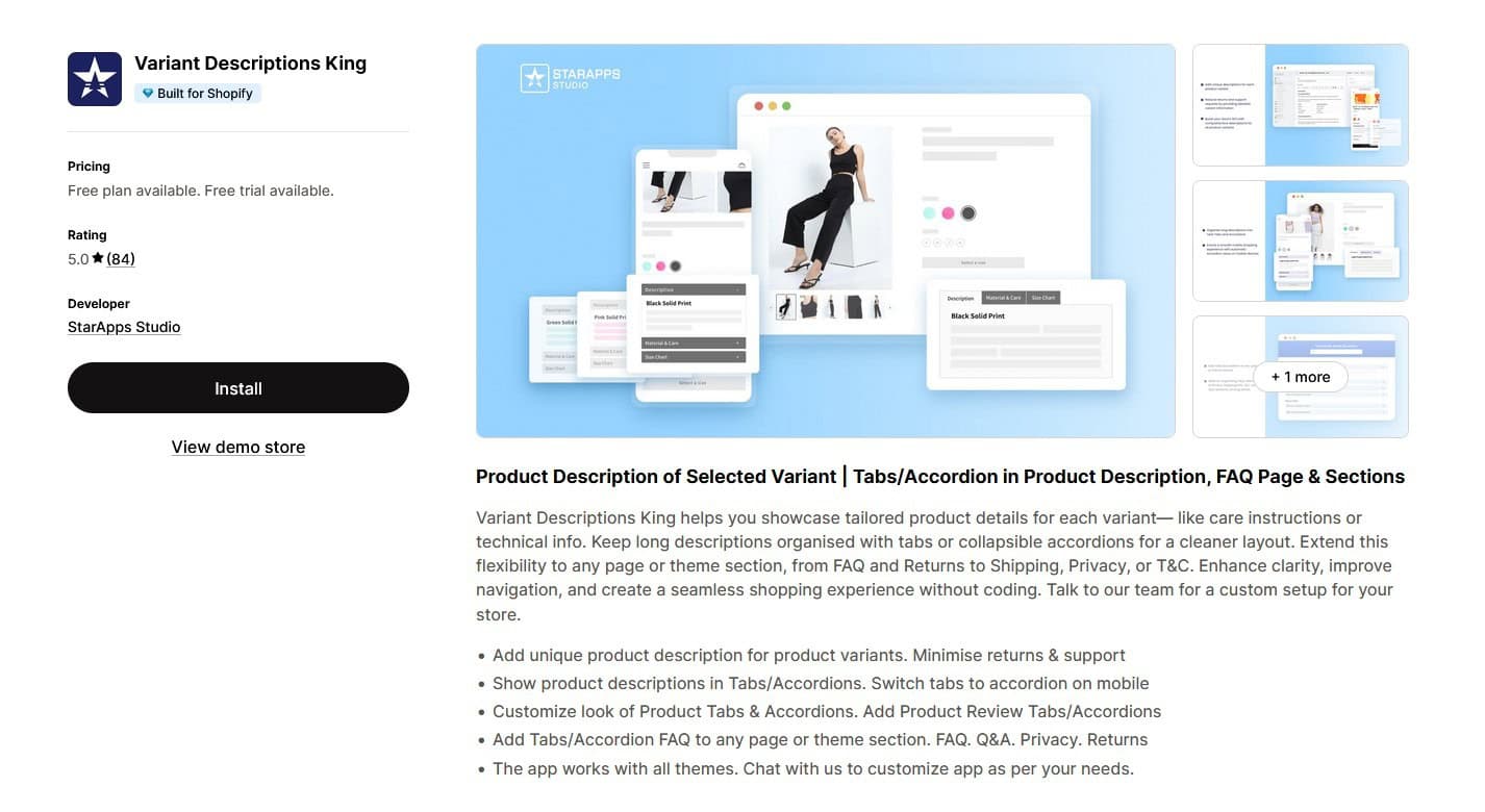 バリエーションの説明 King は、商品ページをクリーンで構造化され、ナビゲートしやすい状態に保ちながら、バリエーションごとに異なる情報を表示したい販売者向けに構築されています。このアプリでは、長くて乱雑な説明の代わりに、選択したバリアントに基づいて動的に更新されるタブまたは折りたたみ可能なアコーディオン内にバリアント固有のコンテンツを表示できます。