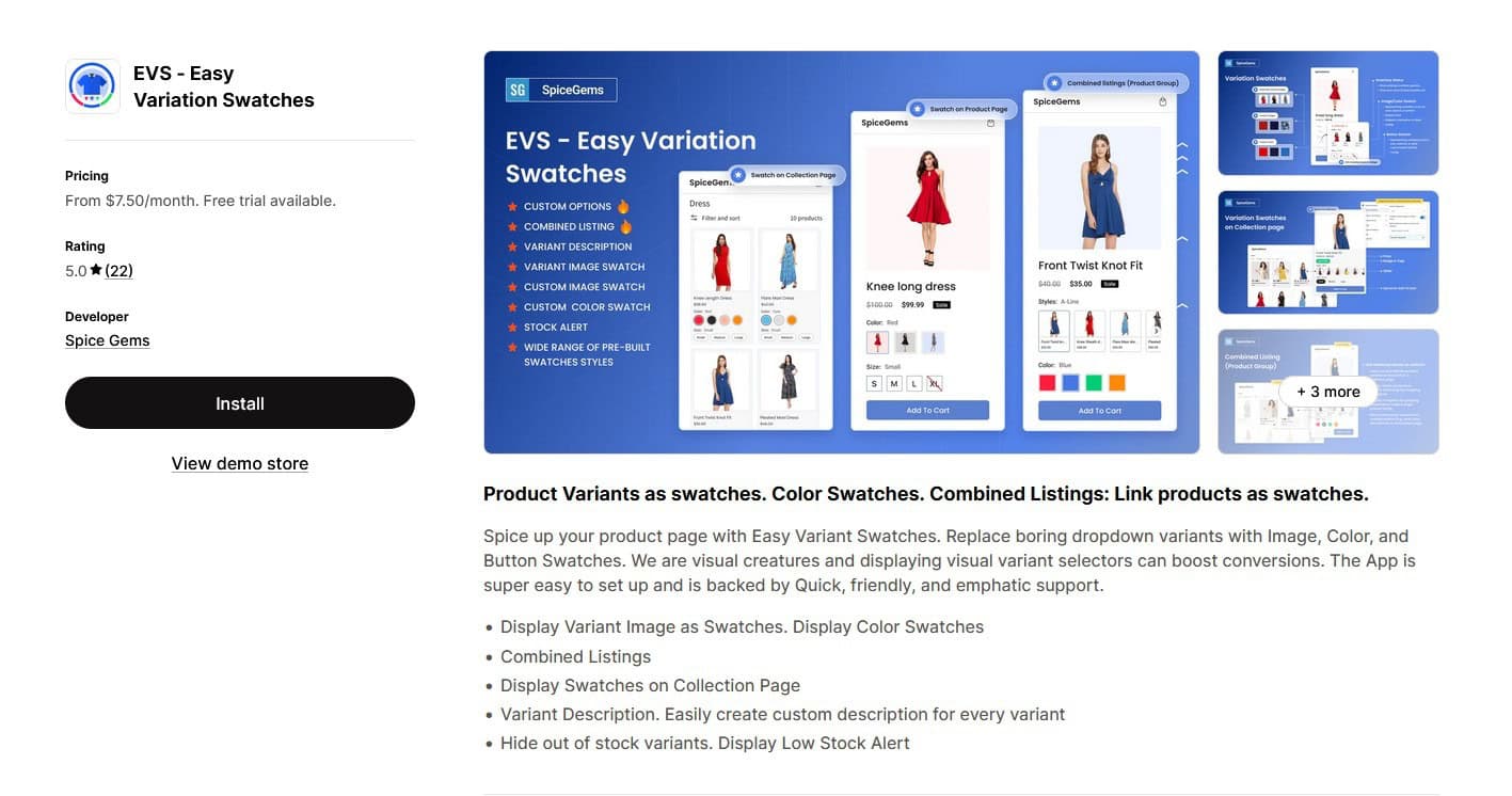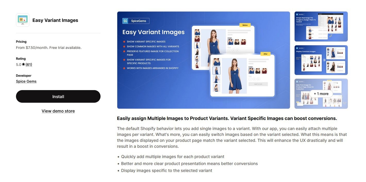 Easy Variant Images は、Shopify の最も一般的な視覚的制限の 1 つを修正します。バリアントは通常、単一の画像に制限されます。このアプリを使用すると、各製品バリエーションに複数の画像を割り当てることができ、顧客が選択したオプションに正確に一致する画像を常に表示できるようになります。
