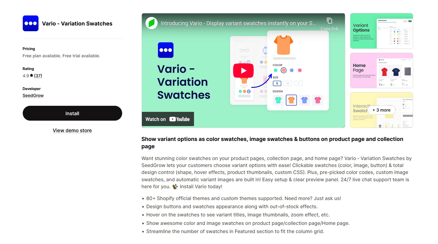 Vario – バリエーション スウォッチは、標準のドロップダウンを色、画像、ボタン スタイルなどの美しくクリック可能なスウォッチに置き換える、デザインに重点を置いたバリアント アプリです。柔軟性と視覚的インパクトの両方を考慮して構築された Vario は、顧客がより迅速にバリエーションを選択できるようにすると同時に、販売者がそれらのオプションの外観と動作を完全に制御できるようにします。