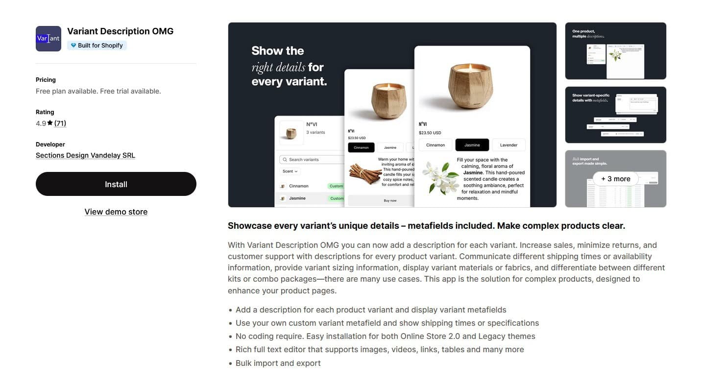 バリアントの説明 OMG は、単なる数行のテキストではなく、バリアント間の意味のある違いを伝える必要がある販売者向けに設計されています。これにより、各製品バリアント (バリアント メタフィールドを含む) に完全な説明を追加できるため、材料、仕様、キット、または出荷要件が異なる複雑な製品に最適です。
