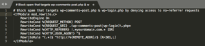 また、このコード内で、保護されたファイルの5行目にwp-login.phpも追加されていることに気付くでしょう。 これにより、wp-login.phpを標的としたスパム攻撃をさらに防ぐことができます。