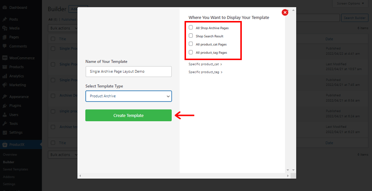 そこで、ここですべてのショップアーカイブページのオプションを有効にします。 次に、下部にある[テンプレートの作成]オプションをクリックします。