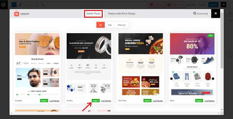とりあえず、スターターパックのセクションを見てみましょう。 ショップページに使用する既製のテンプレートを完全に制御できます。
