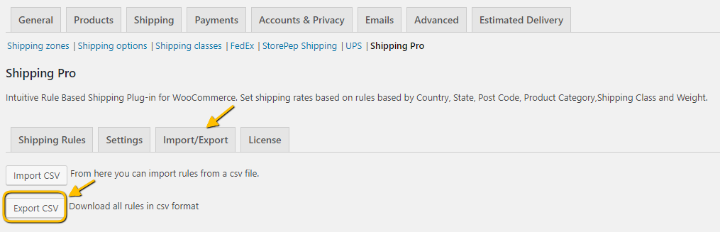 したがって、CSV ファイルですべての配送ルールの準備ができたら、プラグインのインポート/エクスポート設定に戻り、CSV ファイルをプラグインにインポートします。