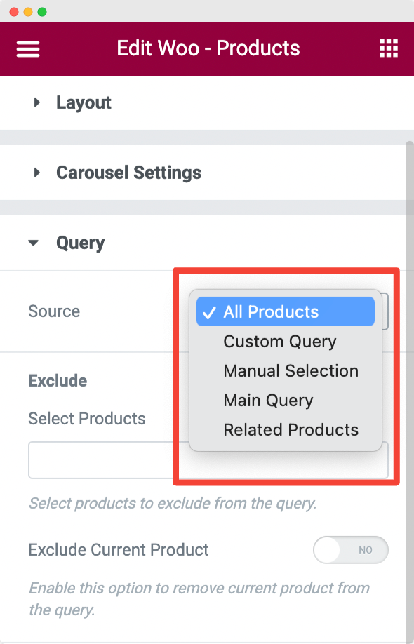 PowerPack Woo – 製品ウィジェットには、組み込みのクエリ ビルダーが含まれています。 この機能を使用すると、すべての製品を表示したり、カスタム クエリを適用してそれらをフィルタリングしたり、各製品を手動で選択する柔軟性を提供したりすることができます。