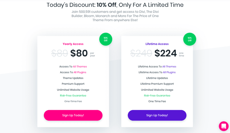 今回は、専用リンクを使用して、Elegant Themes 割引コードを有効にすることができます。 これにより、年間プランと生涯アクセス サブスクリプションが一律 10% 割引になります。