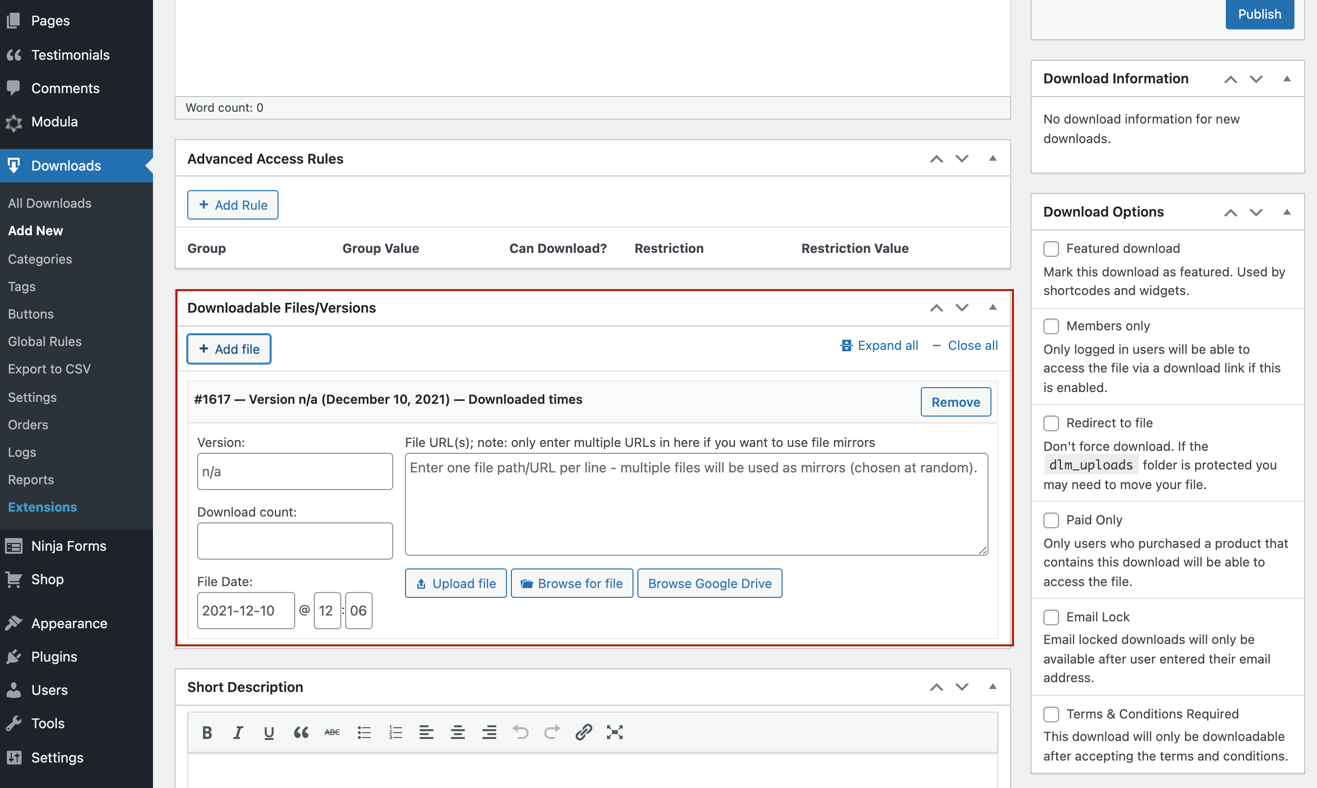 ゲート付きホワイトペーパーをWordPressやその他の種類のダウンロード可能なファイルに追加する方法を知りたい場合は、ダウンロードモニターが便利です。 ダウンロードモニターをインストールしてアクティブにしたら、 WordPressダッシュボード>ダウンロード>新規追加に移動します。 次に、 [ダウンロード可能なファイル/バージョン]まで下にスクロールします。