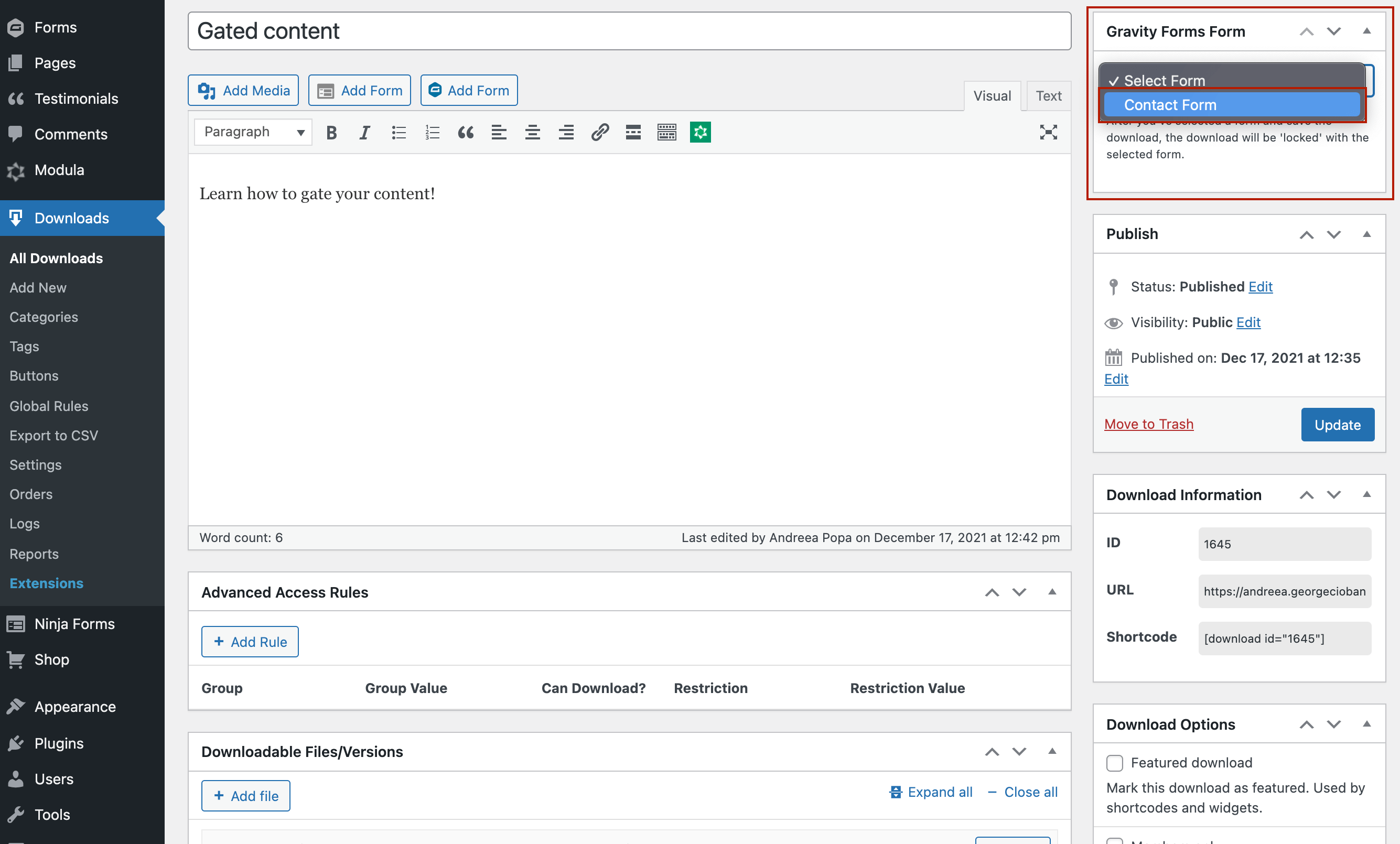 同じページの右側にGravityFormsFormという新しいメタボックスがあります。 ユーザーがダウンロードにアクセスするために入力するフォームを選択します。 私の場合は、お問い合わせフォームを選択します。 プロセスは非常に簡単で、1分以上かかることはありません。
