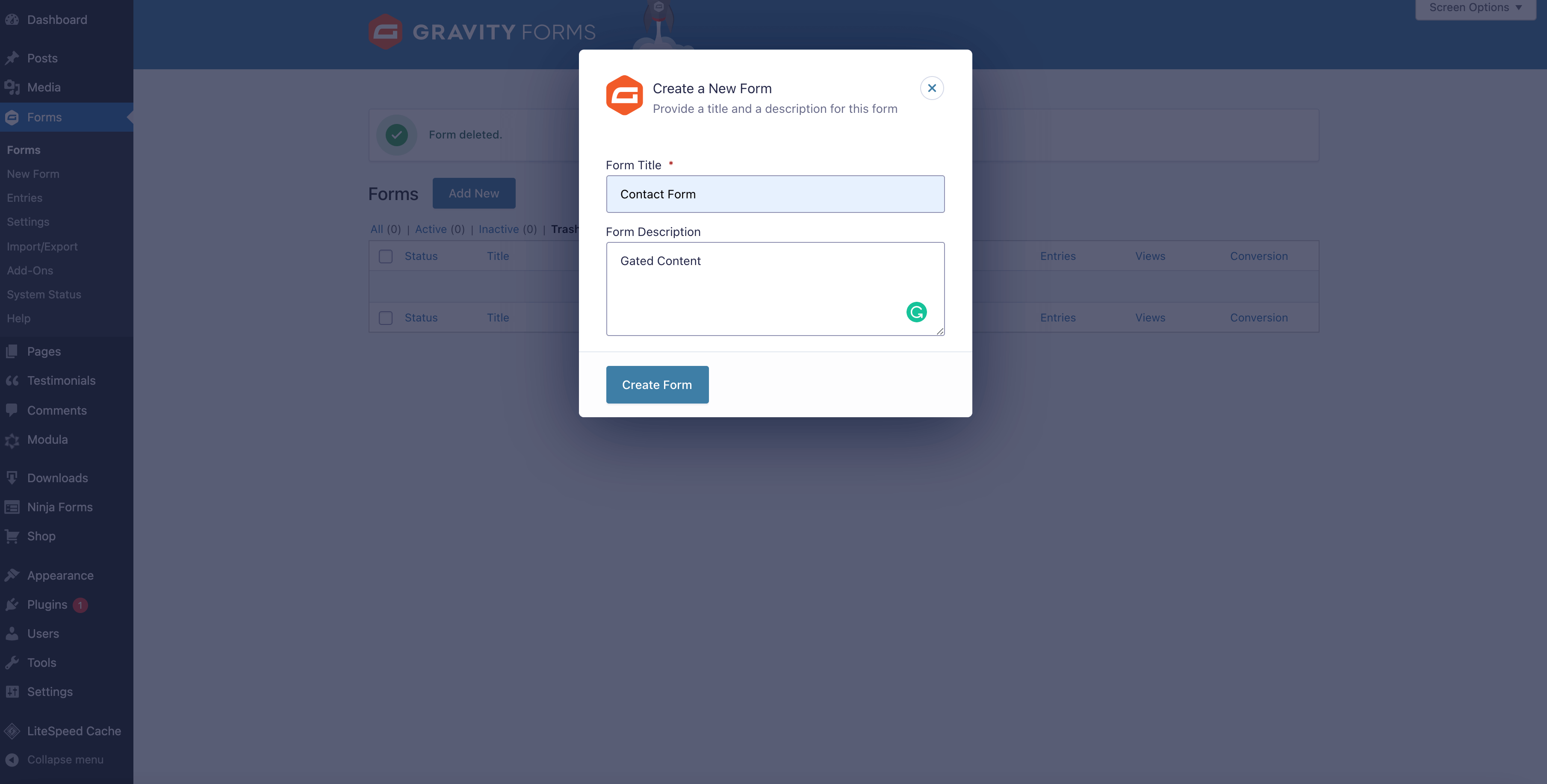 まず、Gravity Formsプラグインがインストールされ、有効なライセンスでアクティブ化されていることを確認してください。 次に、フォームの作成を開始して、ダウンロード可能なコンテンツへのアクセスを制限できます。 WordPressダッシュボード>フォーム>新規追加に移動します。 ここで、フォームのタイトルと説明を追加するように求められます。