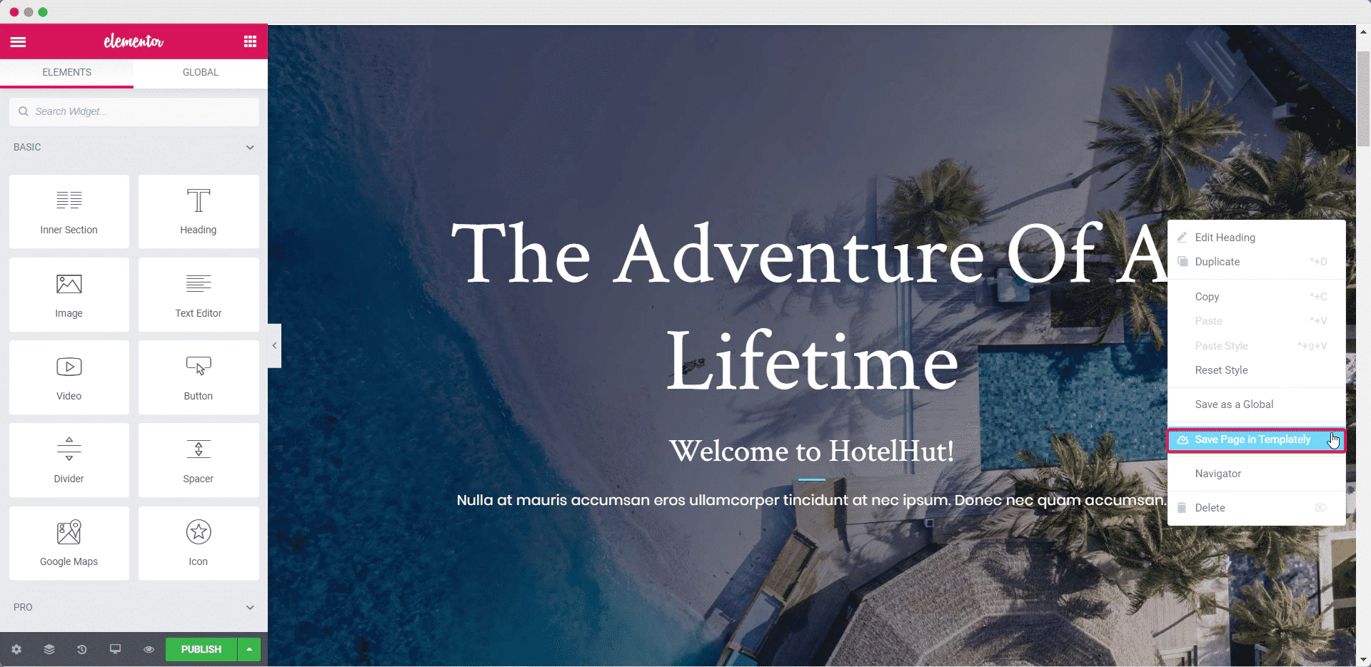 上記のすべての手順を正常に完了した場合は、おめでとうございます。 Elementorを使用して、ほんの数分で独自のWordPressホテル予約Webサイトを作成しました。 準備ができたら、[公開]ボタンをクリックして、美しいWebサイトを世界中の人々と共有します。