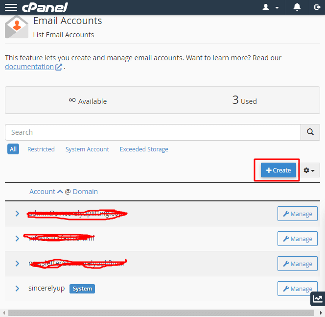 次に、[電子メール アカウント] をクリックします。 すべてのメール アカウントを表示できるページが表示されます。 通常、新しいものを作成しているだけなので、何も見つかりません。 「作成」ボタンをクリックして、新しい登録フォームを開きます。