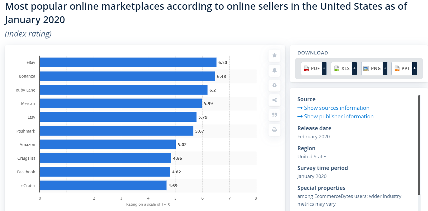 Statistaの調査によると、米国のオンラインマーケットプレイスで最も人気のあるベンダーオプションはeBayです。 ベンダーは、市場を1から10のスケールで評価するように求められました。この評価では、収益性、カスタマーサービス、コミュニケーション、使いやすさの4つの重要な要素が評価されました。 売り手はまた、他の人にマーケットプレイスを推薦するかどうか尋ねられました。