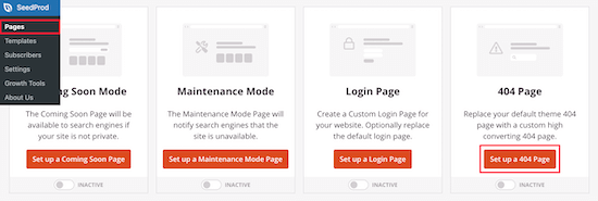 その後、 SeedProd»ページに移動し、「404ページ」メタボックスの「404ページを設定」ボタンをクリックします。