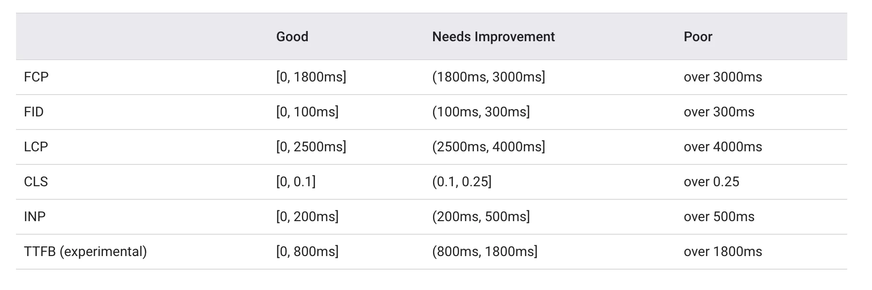 - Interaction to Next Paint (INP)。ユーザーがページにアクセスしている間に発生するすべてのクリック、タップ、キーボード インタラクションのレイテンシを観察することで、ユーザー インタラクションに対するページの全体的な応答性を評価します。 2024 年 3 月から INP が FID に置き換わることに注意してください。