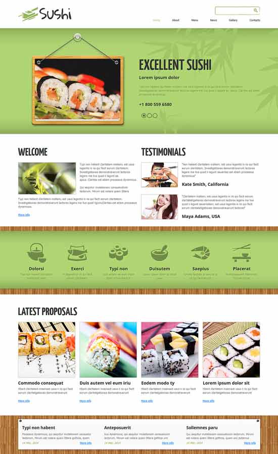 レストランは、特別な日やビジネスランチを楽しんだり、静かな雰囲気の中で友達と楽しい会話を楽しみたいときに外食するのに最適な場所です。 このウェブデザインは、家族的なタイプの感触が続いている、本当に素晴らしい外観を持っています。 あなたの訪問者があなたが提供するものに間違いなく興味を持ってくれるであろう食欲をそそる写真と組み合わせたたくさんのまたは色とグラフィックスを特徴とするならば。 画像上でマウスオーバーが発生すると、クライアントは別のページに移動しなくても、関心のある製品またはカテゴリに関する詳細情報を確認できます。 一言で言えば、これは、洗練されたフードレストランのために、ナビゲートしやすく、しかも効果的なデザインが必要な場合に最適な選択です。