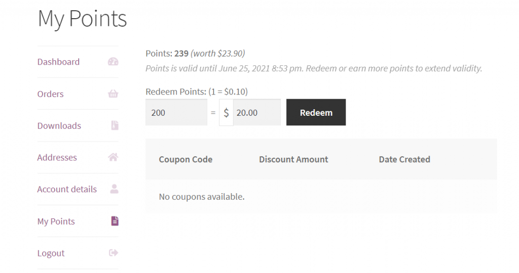 ポイントを獲得または交換するには、アカウントを作成する必要があります。 次に、サイトに追加された「マイ アカウント」カスタム インターフェイスからポイントにアクセスできます。