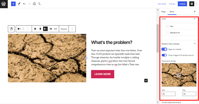 ここでは2列のパターンを作成するため、 50/50の2列のブロックを選択しました。 また、右側の設定オプションから選択に合わせて列を調整できます。