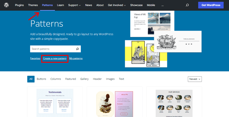 ブロックパターンを作成するには、まず、WordPress.orgの公式Webサイトの[パターン]メニューに移動します。