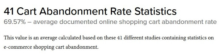 Baymard Institute에 따르면 장바구니 포기는 선호하지 않습니다. 실제로 전자 상거래 장바구니 포기율에 대한 인상적인 41개 연구를 결합한 후 평균 장바구니 포기율이 70% 미만인 것으로 나타났습니다.