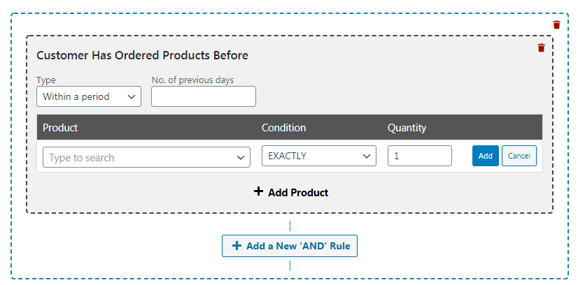 옵션을 하나 더 살펴보겠습니다. "이전에 주문한 적이 있음"을 선택하면 하나 이상의 특정 제품을 선택하고 설정된 기간을 선택할 수 있습니다.